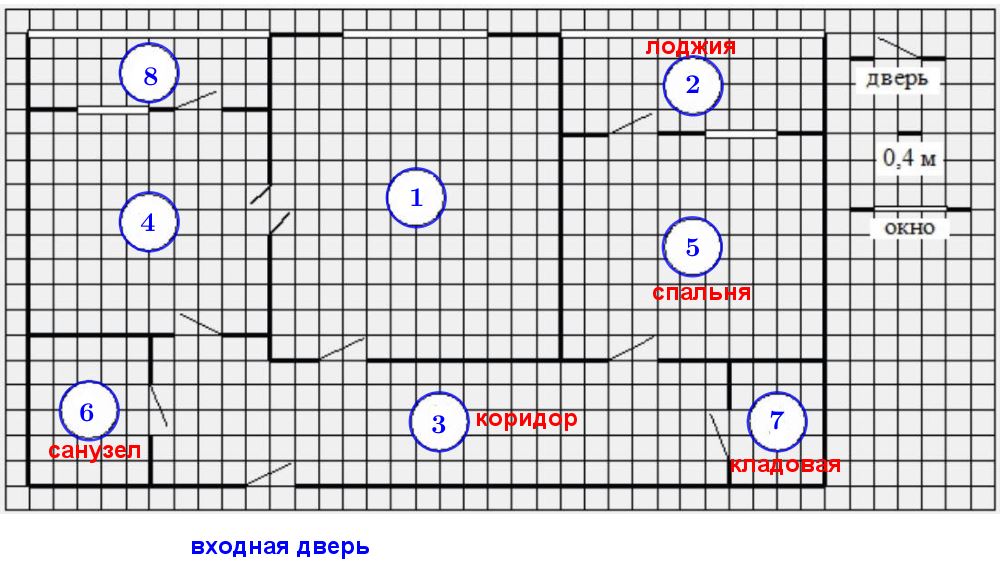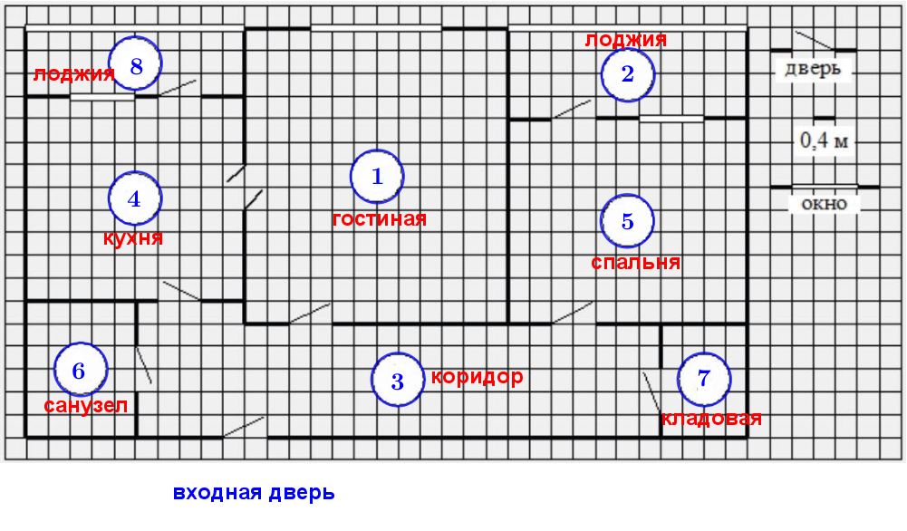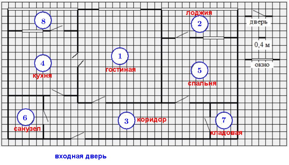 На рисунке изображён план двухкомнатной квартиры в многоэтажном жилом доме. Сторона одной клетки на плане соответствует \(\displaystyle 0{,}4\)м, а условные обозначения двери и окна приведены в правой части рисунка.