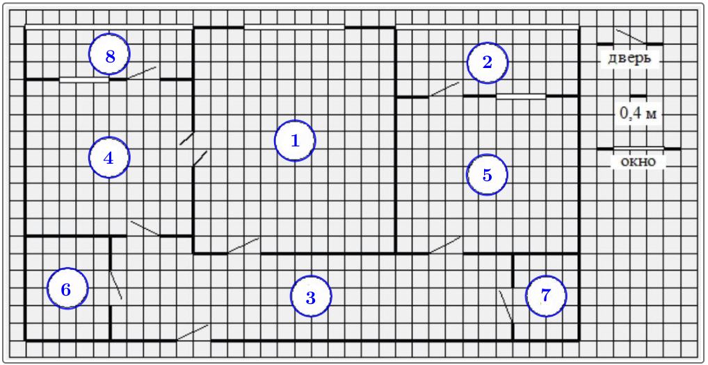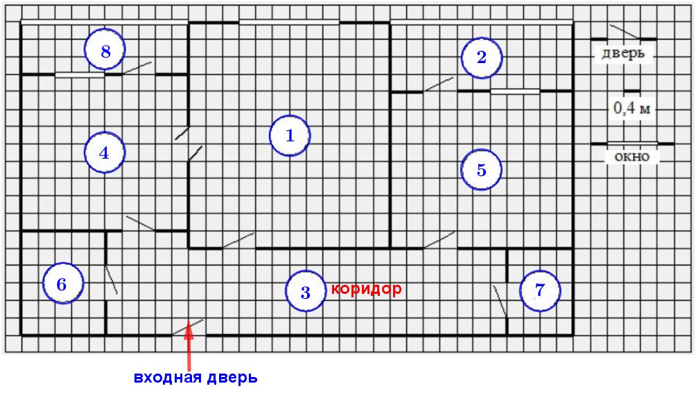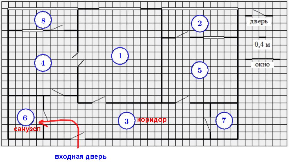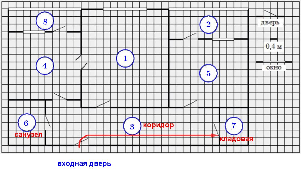 Входная дверь ведет в помещение номер \(\displaystyle 3 \small.\) Значит, коридор обозначен цифрой \(\displaystyle \red3 {\small.}\)
