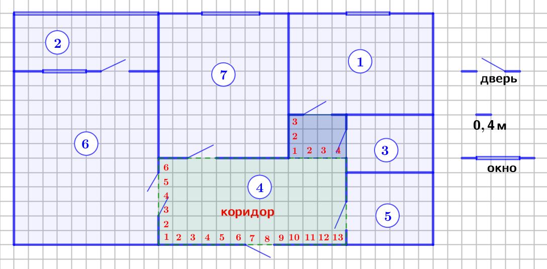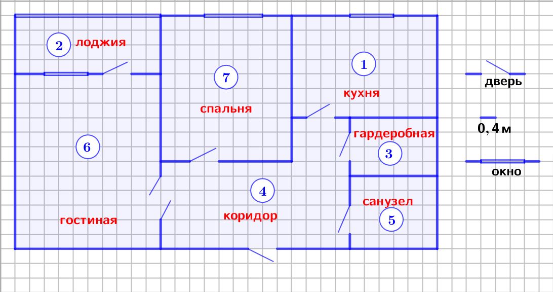 На рисунке изображён план двухкомнатной квартиры в многоэтажном жилом доме. Сторона одной клетки на плане соответствует \(\displaystyle 0{,}4\)м.