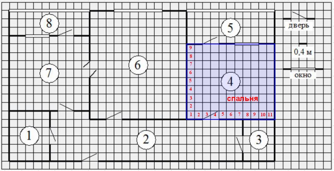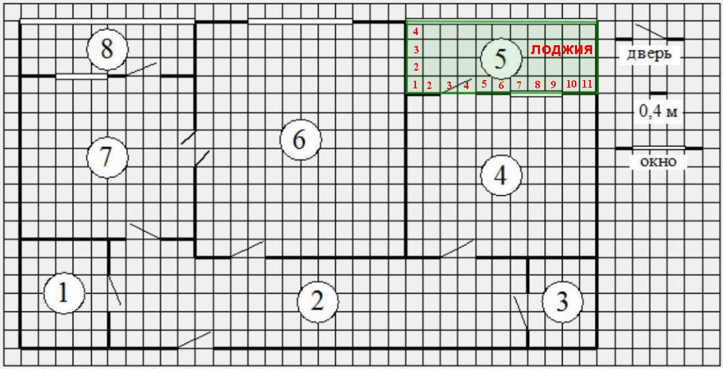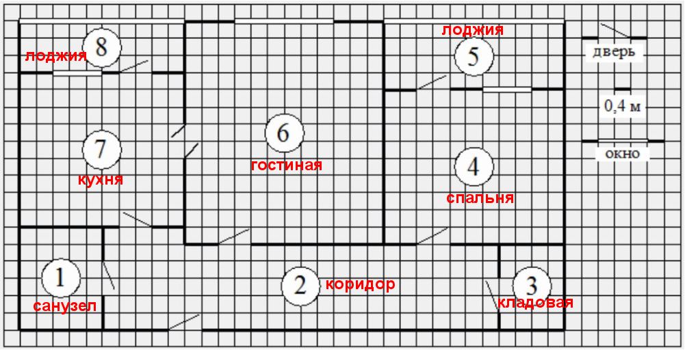 На рисунке изображён план двухкомнатной квартиры в многоэтажном жилом доме. Сторона одной клетки на плане соответствует \(\displaystyle 0{,}4\)м.