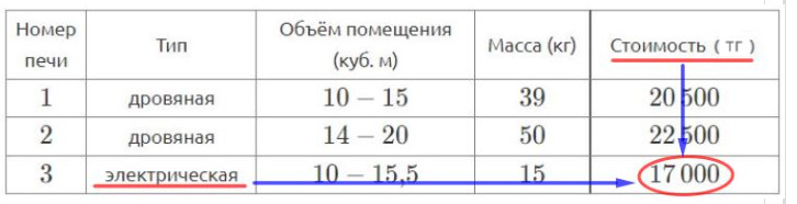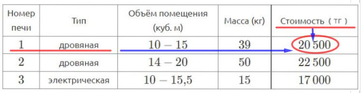 | Номер печи | Тип | Объём помещения (куб. м) | Масса (кг) | Стоимость (тг.) |