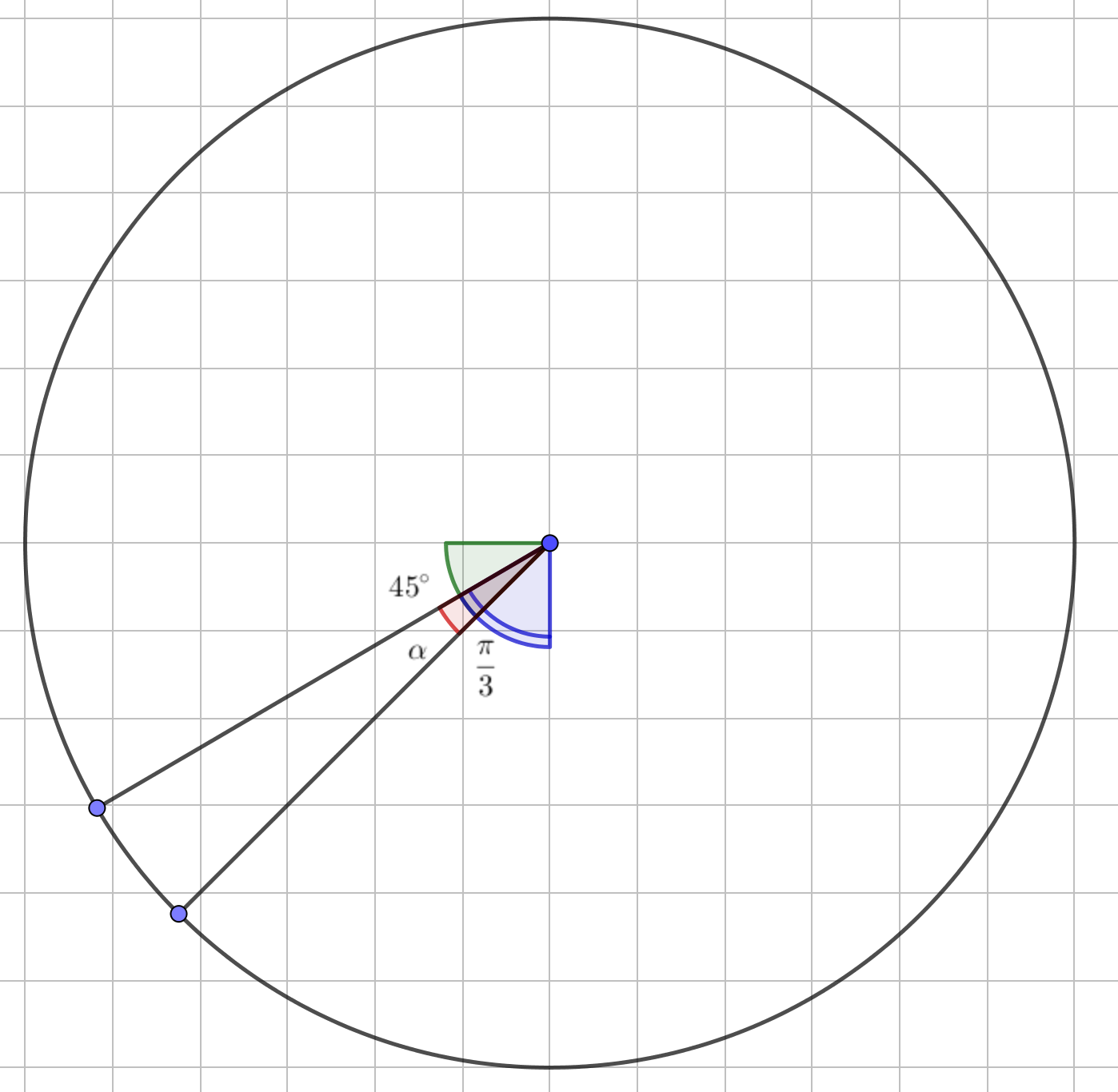 \(\displaystyle \alpha=\frac{\pi}{4}+\frac{\pi}{3}-\frac{\pi}{2}{ \small ,}\)