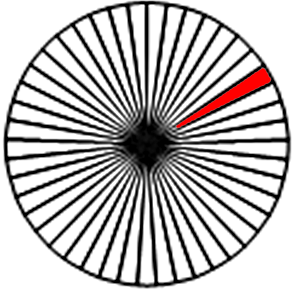 \(\displaystyle 45\) радиусов делят окружность на \(\displaystyle 45\) секторов. По условию задачи углы между соседними радиусами равны. Значит, углы секторов равны. Полный угол окружности составляет \(\displaystyle 360^{\circ} {\small.}\) Чтобы найти угол одного сектора, нужно \(\displaystyle 360^{\circ}\) разделить на \(\displaystyle 45\) частей. То есть \(\displaystyle 360^{\circ}:45=8^{\circ} \small.\) Угол между соседними спицами колеса равен \(\displaystyle 8^{\circ} {\small.} \) | ![]() |