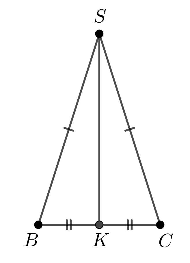 В правильной треугольной пирамиде \(\displaystyle SABC\) точка \(\displaystyle K\) – середина ребра \(\displaystyle BC{\small ,}\) \(\displaystyle S\) – вершина. Известно, что \(\displaystyle SK = 4{\small ,}\) а \(\displaystyle AC=9{\small .}\) Найдите площадь боковой поверхности пирамиды.