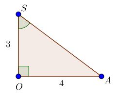 Угол \(\displaystyle SOA\) прямой, \(\displaystyle OA=4{\small,}\) \(\displaystyle SO=3{\small.}\)