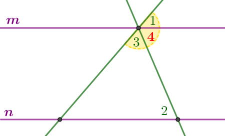 ![]() | Обозначим на рисунке угол \(\displaystyle {\color {red} 4} {\small.}\) Углы \(\displaystyle 1 {\small,}\) \(\displaystyle 3\) и \(\displaystyle {\color {red} 4} \) в сумме образуют развёрнутый угол. Значит, \(\displaystyle \angle 1+ \angle {\color {red} 4}+\angle 3=180^{\circ} {\small.}\) |