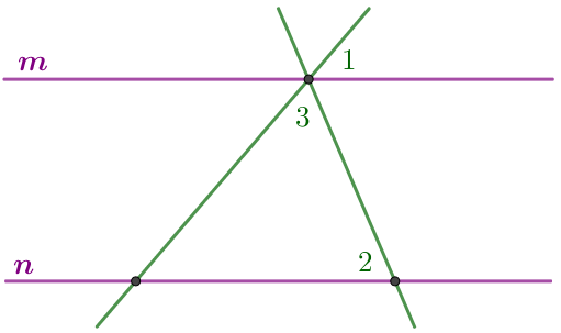 Прямые \(\displaystyle m\) и \(\displaystyle n\) параллельны (см. рисунок). Найдите \(\displaystyle \angle 3 {\small,}\) если \(\displaystyle \angle 1 =66^{\circ} {\small,}\) \(\displaystyle \angle 2=88^{\circ} {\small.}\) Ответ дайте в градусах.