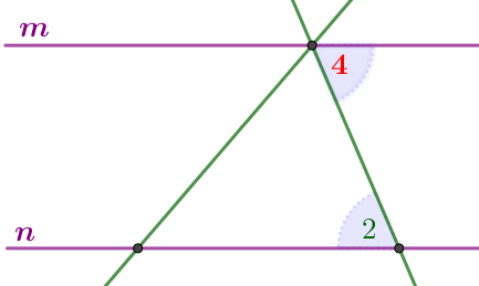 По условию прямые \(\displaystyle m\) и \(\displaystyle n\) параллельны. \(\displaystyle \angle 2 \) и \(\displaystyle \angle {\color {red} 4}\) – накрест лежащие углы. Следовательно, \(\displaystyle \angle {\color {red} 4}=\angle 2 {\small.}\) Тогда \(\displaystyle \angle 1+\angle 2+ \angle 3=180^{\circ} {\small.}\) Получаем \(\displaystyle 66^{\circ}+88^{\circ}+ \angle 3=180^{\circ} {\small,}\) \(\displaystyle \angle 3=180^{\circ}-(66^{\circ}+88^{\circ})=180^{\circ}-154^{\circ}=26^{\circ} {\small.}\) | ![]() |