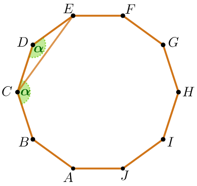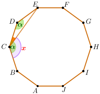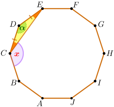 ![]() | Пусть угол правильного десятиугольника равен \(\displaystyle \color{darkgreen} \alpha \) и \(\displaystyle \angle BCE = \color{red}x {\small.}\) Тогда \(\displaystyle \color{red}x= \color{darkgreen} \alpha- \angle DCE{\small.}\)