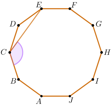 \(\displaystyle ABCDEFGHIJ\) – правильный десятиугольник. Найдите угол \(\displaystyle BCE{\small.}\) Ответ дайте в градусах.