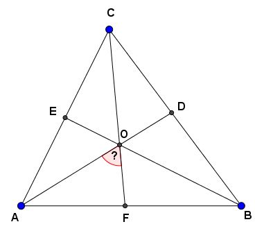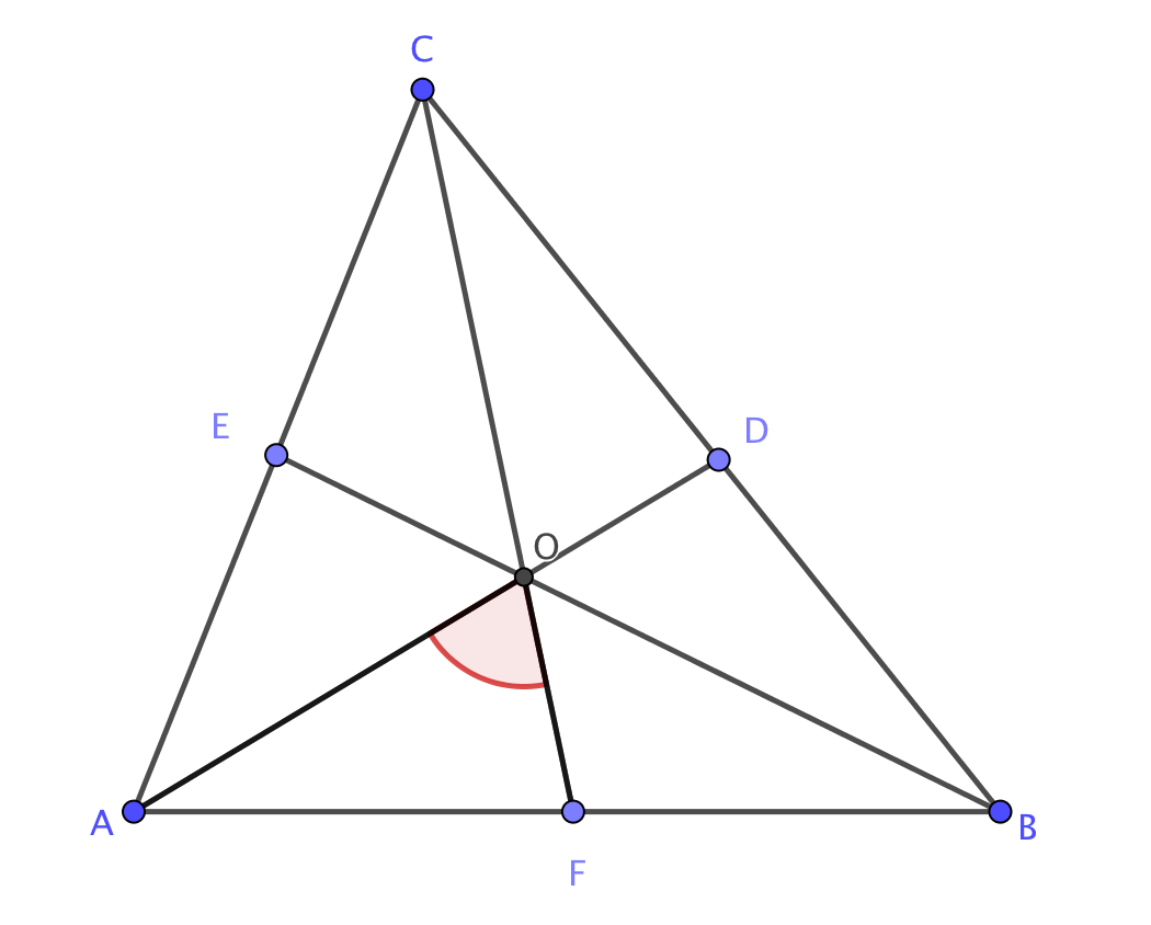 В треугольнике \(\displaystyle ABC\) угол \(\displaystyle \angle A\) равен \(\displaystyle 60^\circ{\small , }\) угол \(\displaystyle \angle B\) равен \(\displaystyle 82^\circ{\small , }\) \(\displaystyle AD{\small,}\) \(\displaystyle BE\) и \(\displaystyle CF\) – биссектрисы, пересекающиеся в точке \(\displaystyle O{\small .}\)  Найдите угол \(\displaystyle AOF{\small .}\)