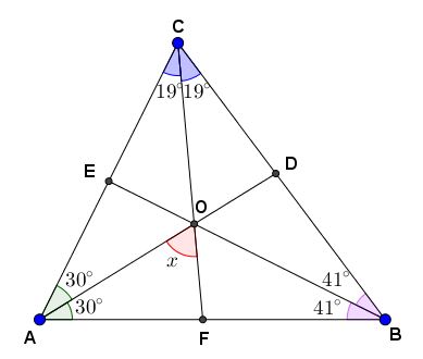 Пусть \(\displaystyle x \) градусов искомый угол \(\displaystyle AOF{\small . } \) Так как \(\displaystyle AD{\small,}\) \(\displaystyle DE\) и \(\displaystyle CF\) – биссектрисы, то получаем следующие значения углов: