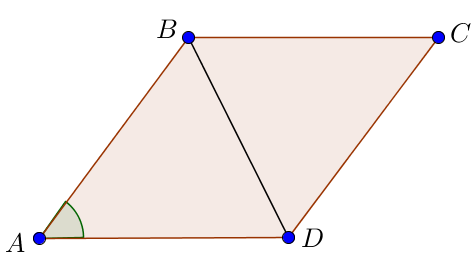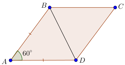 В ромбе \(\displaystyle ABCD\) сторона равна \(\displaystyle 4 \small,\) угол \(\displaystyle BAD\) равен \(\displaystyle 60^\circ \small.\) Найдите диагональ \(\displaystyle BD\) ромба.