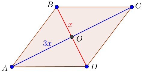 Пусть \(\displaystyle BD=x\) – меньшая диагональ ромба, тогда \(\displaystyle AC=3x \) – большая диагональ ромба.