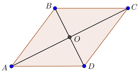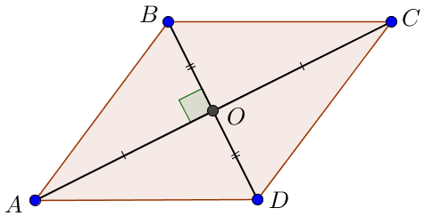 По свойству ромба диагонали \(\displaystyle AC\) и \(\displaystyle BD\) перпендикулярны, по свойству параллелограмма они делятся пополам точкой \(\displaystyle O \small.\) Тогда прямоугольные треугольники \(\displaystyle AOB \small,\) \(\displaystyle COB \small,\) \(\displaystyle COD\) и \(\displaystyle AOD\) равны по двум катетам.