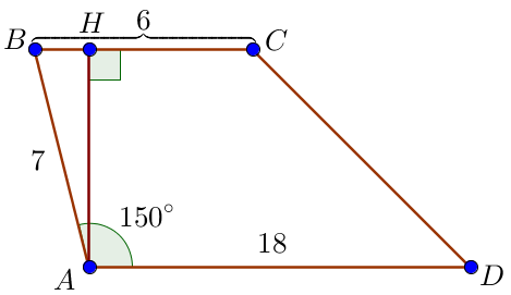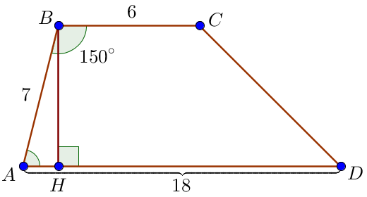 Основания трапеции равны \(\displaystyle 18\) и \(\displaystyle 6\small,\) боковая сторона, равная \(\displaystyle 7\small,\) образует с одним из оснований трапеции угол \(\displaystyle 150^\circ\small.\) Найдите площадь трапеции.