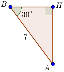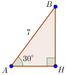 Нам известны острый угол \(\displaystyle \angle BAH=30^{\circ}\) и гипотенуза \(\displaystyle AB=7\small.\)