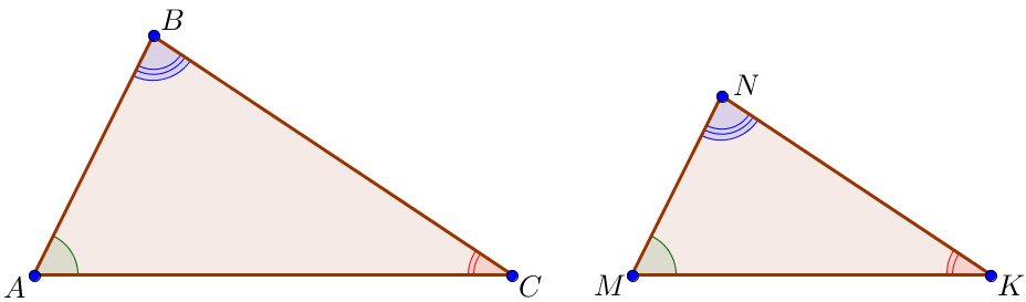 \(\displaystyle \angle A = \angle M \small, \) \(\displaystyle \angle B = \angle N \small, \) \(\displaystyle \angle C = \angle K \small, \)