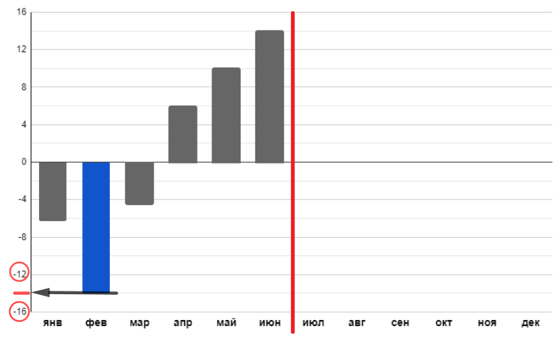 Значит, этой отметке соответствует значение в \(\displaystyle \color{Red}{-14}\) градусов Цельсия.