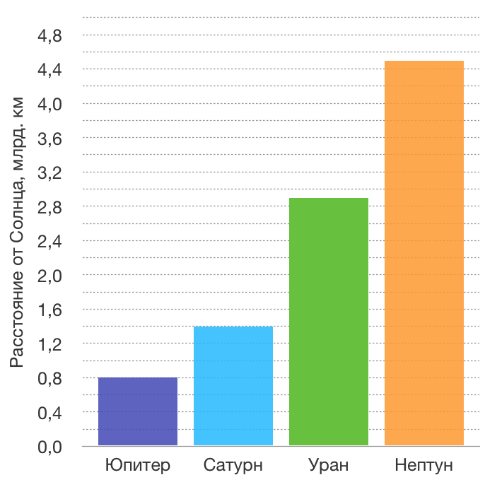 На диаграмме приведены значения расстояний от некоторых планет Солнечной системы до Солнца. Верхняя граница каждого столбца диаграммы (прямоугольника, соответствующего каждой из планет) находится на одной горизонтали с делением вертикальной шкалы, обозначающим соответствующе расстояние от данной планеты до Солнца.