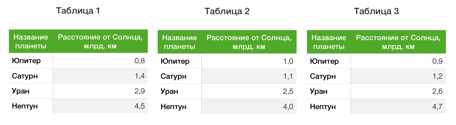 Теперь сравним эти значения с данными трех таблиц. Видно, что именно таблица 1 правильно представляет данные столбчатой диаграммы.