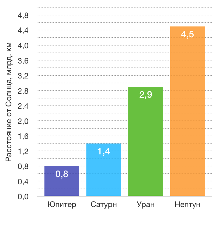 На столбчатой диаграмме представлены данные о расстояниях между Солнцем и некоторыми планетами Солнечной системы.