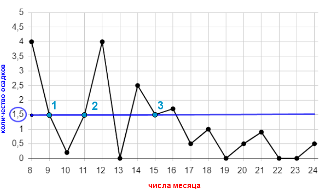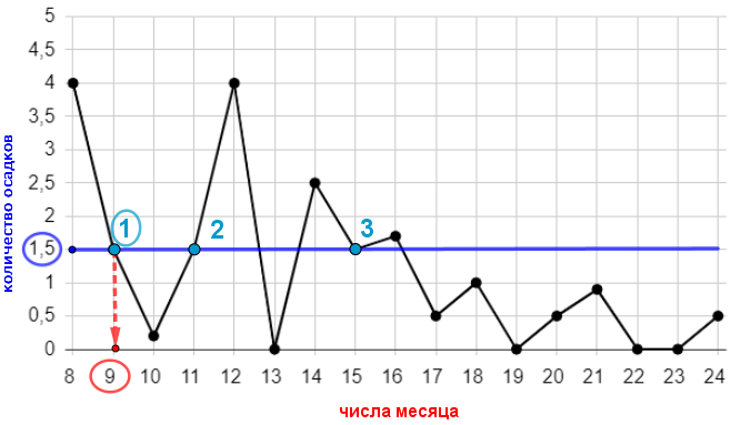 День, когда впервые выпало ровно \(\displaystyle 1{,}5\) миллиметра осадков, соответствует точке с номером \(\displaystyle 1{\small.}\)