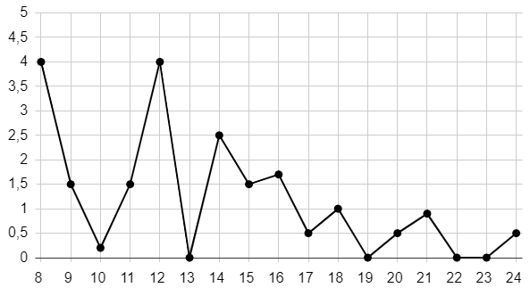 На рисунке жирными точками показано суточное количество осадков, выпадавших в Караганде с \(\displaystyle 8\) по \(\displaystyle 24\) января \(\displaystyle 2005\) года. По горизонтали указываются числа месяца, по вертикали количество осадков, выпавших в соответствующий день, в миллиметрах. Для наглядности жирные точки на рисунке соединены линией. Определите по рисунку, какого числа в Караганде впервые выпало ровно \(\displaystyle 1{,}5\) миллиметра осадков.