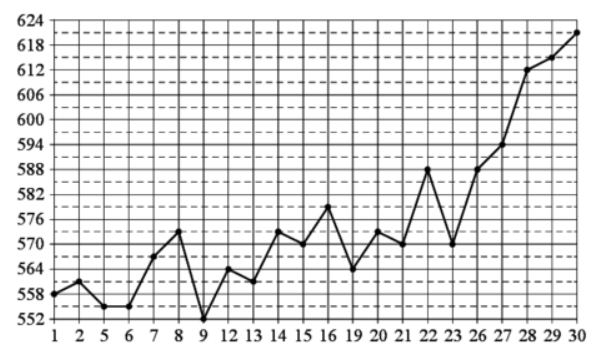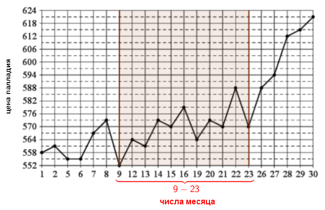 На рисунке жирными точками показана цена палладия, установленная Народным банком РК во все рабочие дни в октябре \(\displaystyle 2010\) года. По горизонтали указываются числа месяца, по вертикали цена палладия в тенге за грамм. Для наглядности жирные точки на рисунке соединены линией. Определите по рисунку какого числа в период с \(\displaystyle 9\) по \(\displaystyle 23\) октября цена палладия была наибольшей.