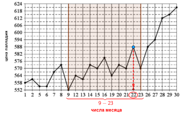 Наибольшей цене палладия в указанный период соответствует самая высокая точка выделенной области. Отметим эту точку и определим, какой дате она соответствует.