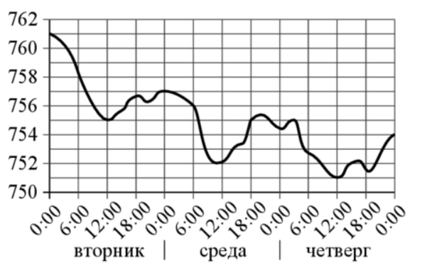 На рисунке изображён график изменения атмосферного давления в городе Энске за три дня. По горизонтали указаны дни недели и время, по вертикали — значения атмосферного давления в миллиметрах ртутного столба. Найдите значение атмосферного давления в четверг в \(\displaystyle 12\) часов дня. Ответ дайте в миллиметрах ртутного столба.