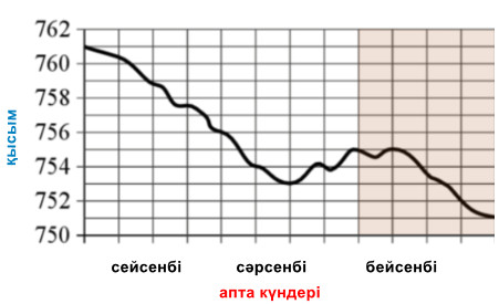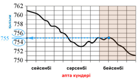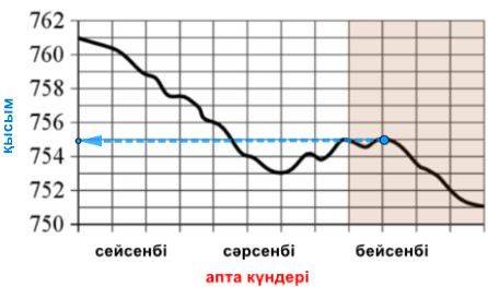 Белгіленген аймақтағы графиктің ең жоғары нүктесіне бейсенбідегі атмосфералық қысымның ең жоғары мәні сәйкес келеді.Бұл нүктені белгілеп,тік осьтің қандай нүктеге сәйкес келетіндігін анықтаймыз.