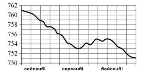Суретте Энске қаласында үш күн ішінде атмосфералық қысымның өзгеру графигі көрсетілген. Көлденеңінен аптаның күндері, тігінен-сынап бағанының миллиметріндегі атмосфералық қысым мәндері көрсетілген. Бейсенбідегі атмосфералық қысымның ең жоғары мәнін көрсетіңіз (сынап бағанының миллиметрімен).