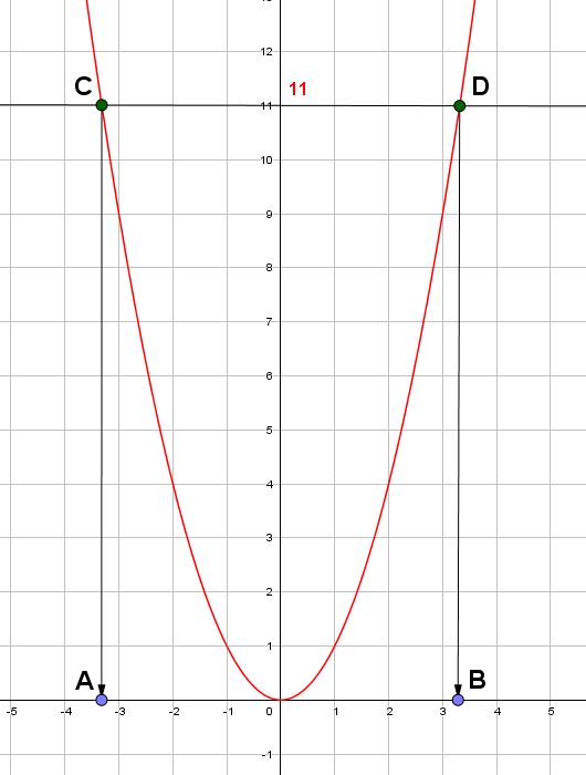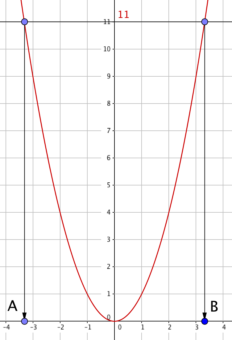 С другой стороны, координаты этих точек удовлетворяют уравнению параболы \(\displaystyle y=x^2{\small , } \) на которой они лежат. Так как в нашем случае \(\displaystyle y=11{\small , } \) то
