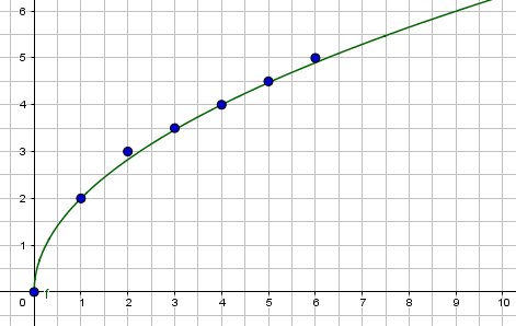 | \(\displaystyle y=2\sqrt{x}\) | \(\displaystyle 0\) | \(\displaystyle 2\) | \(\displaystyle 3\) | \(\displaystyle 3{,}5\) | \(\displaystyle 4\) | \(\displaystyle 4{,}5\) | \(\displaystyle 5\) |