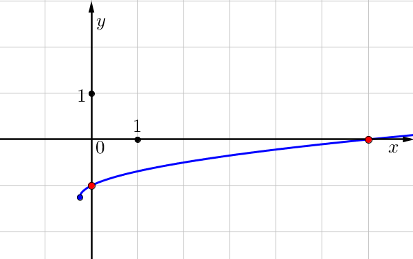 • при подстановке \(\displaystyle x=\color{red}{0}\) и \(\displaystyle y=\color{red}{-1}\)  в уравнение \(\displaystyle y=\color{orange}{k}\sqrt{x+\color{blue}{b}}-\frac{5}{4}\) получим первое верное равенство,