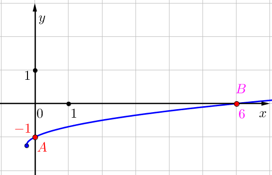 Точки \(\displaystyle \color{red}{A(0;-1)}\) и \(\displaystyle \color{Magenta}{B(6;0)}\) лежат на графике функции   \(\displaystyle f\left(x\right)=\color{orange}{k}\sqrt{x+\color{blue}b}-\frac{5}{4}\small.\)
