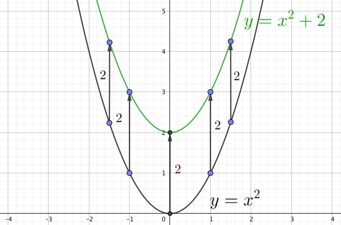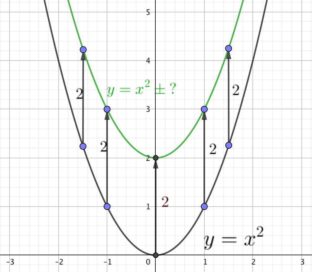 Запишите уравнение параболы, полученной с помощью сдвига параболы \(\displaystyle y=x^2\) на \(\displaystyle 2\) единицы вверх (вдоль оси \(\displaystyle \rm OY\)).