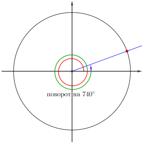 Для этого выделялось из \(\displaystyle 740^{\circ}\) по \(\displaystyle 360^{\circ}{\small,}\) пока это было возможно. После выделения всех оборотов остаток и был нужным углом.