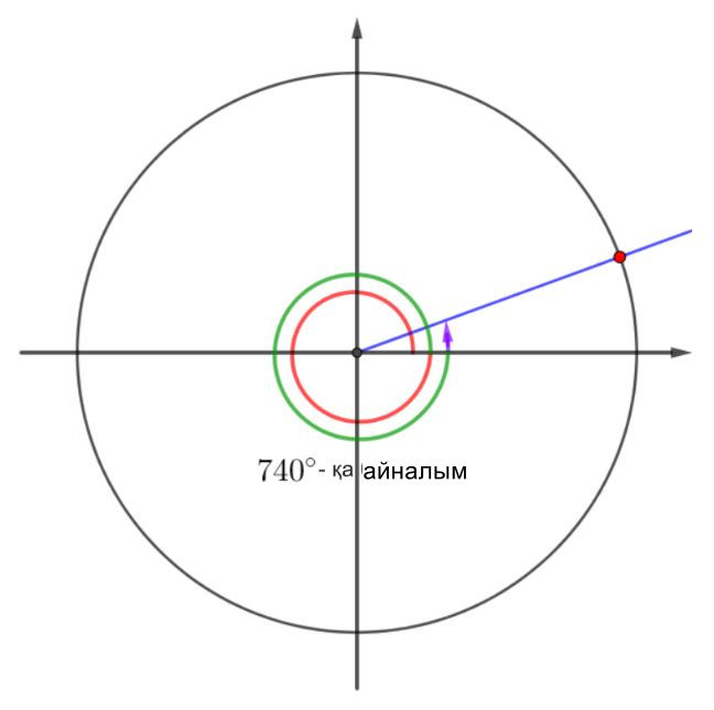 • \(\displaystyle 740^{\circ} \ge 360^{\circ}{\small,}\) выделим \(\displaystyle 360^{\circ}\) из \(\displaystyle 740^{\circ}{\small.}\) Получаем, что после первого полного оборота остается  \(\displaystyle 740^{\circ}-360^{\circ}=380^{\circ}{\small.}\)