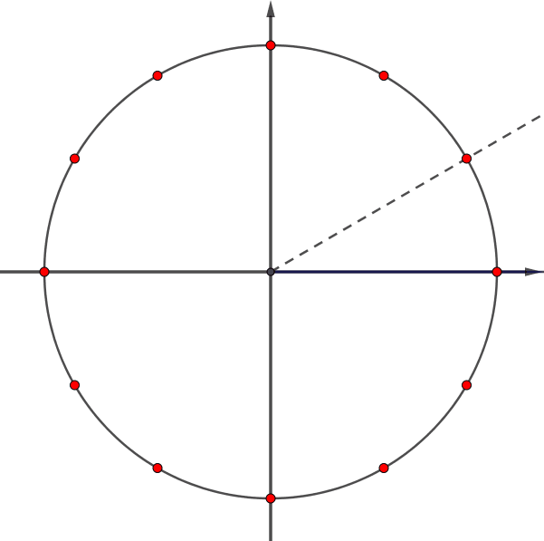 Луч вращается против часовой стрелки, поэтому угол поворота положительный. Луч проходит одну дугу между красными точками, поэтому угол поворота равен \(\displaystyle 30^\circ{\small.}\)