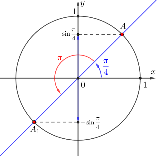 Остается найти синус угла \(\displaystyle \pi+\frac{\pi}{4}\) радиан.