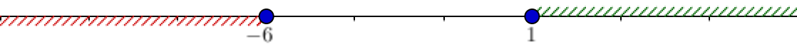\(\displaystyle \left\{ \begin{aligned} x&\ge 1{ \small ,}\\ x &\le -6 \end{aligned} \right.\)