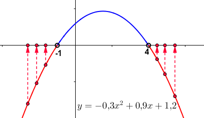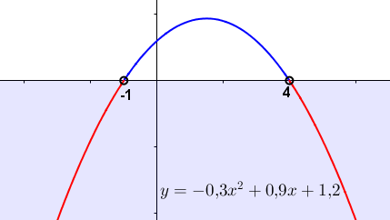 Значит, для решения неравенства \(\displaystyle -0{,}3x^2 +0{,}9x +1{,}2<0\) нужно выбрать на параболе те точки, у которых вторая координата \(\displaystyle y \) меньше нуля.