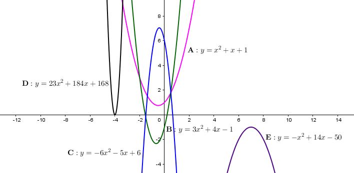 | \(\displaystyle \color{brown}{{\rm \bf E}:\, -x^2+14x-50=0}\) | нет | \(\displaystyle {\rm D}<0 \) |