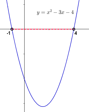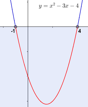 Для параболы \(\displaystyle y=x^2 - 3x -4 \) это означает, что надо найти те значения \(\displaystyle x{ \small ,} \) для которых \(\displaystyle y \) меньше нуля.