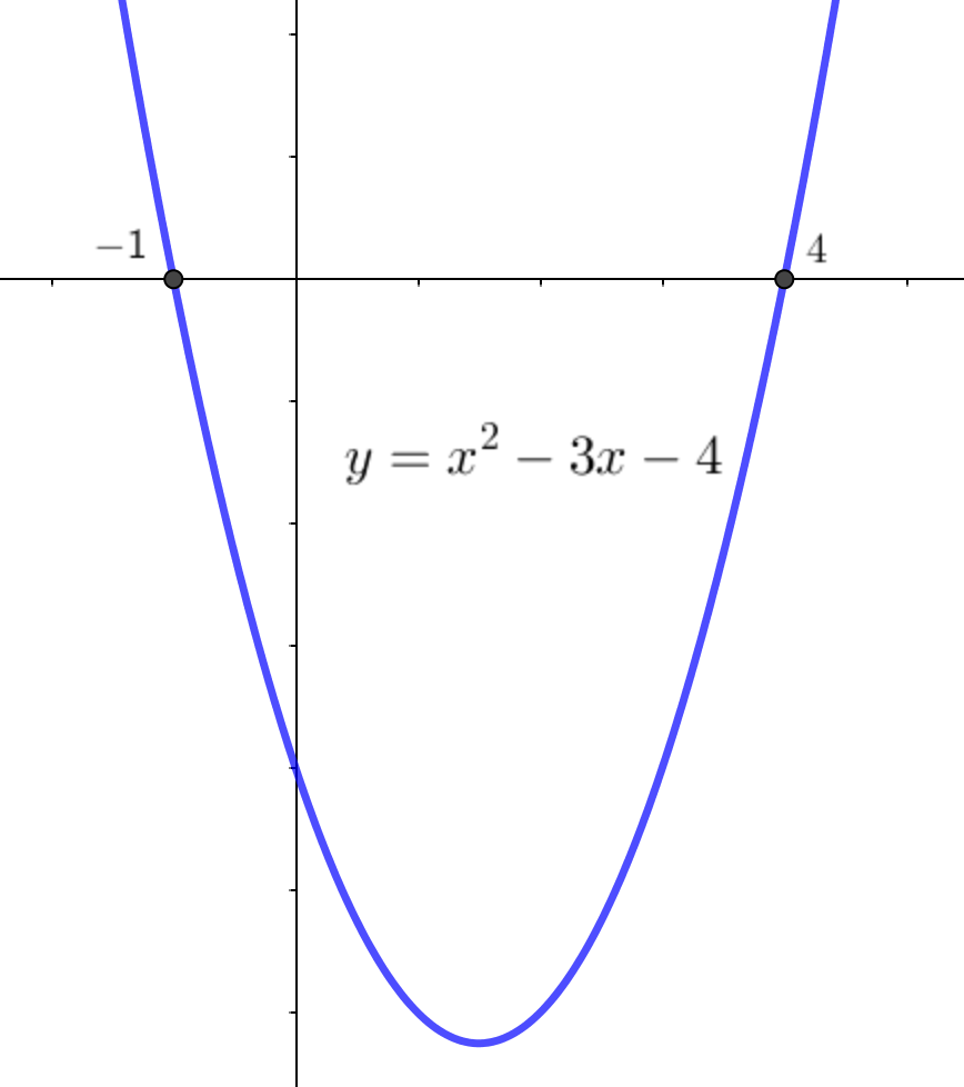Для решения неравенства \(\displaystyle x^2 - 3x -4<0\) надо найти те значения \(\displaystyle x{ \small ,} \) которые дают значение \(\displaystyle x^2 - 3x -4 \) меньше нуля.