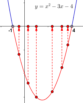 Получаем, что это точки, лежащие между точек пересечения параболы с осью \(\displaystyle \rm OX\) (без точек пересечения, так как в них \(\displaystyle x^2 - 3x -4=0\)).