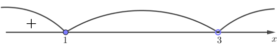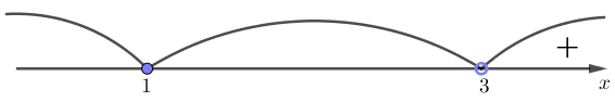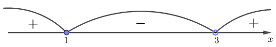 Таким образом, получили следующие знаки на интервалах \(\displaystyle (-\infty;1){ \small ,} \, (1;3)\) и \(\displaystyle (3;+\infty){\small :}\)