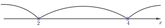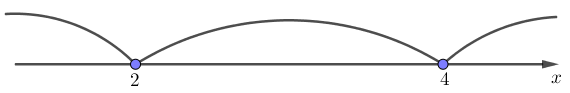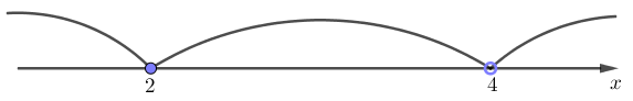 Так как \(\displaystyle x=2\) и \(\displaystyle x=4 \) – обращают в ноль знаменатель, то они обозначаются выколотыми. Получаем: